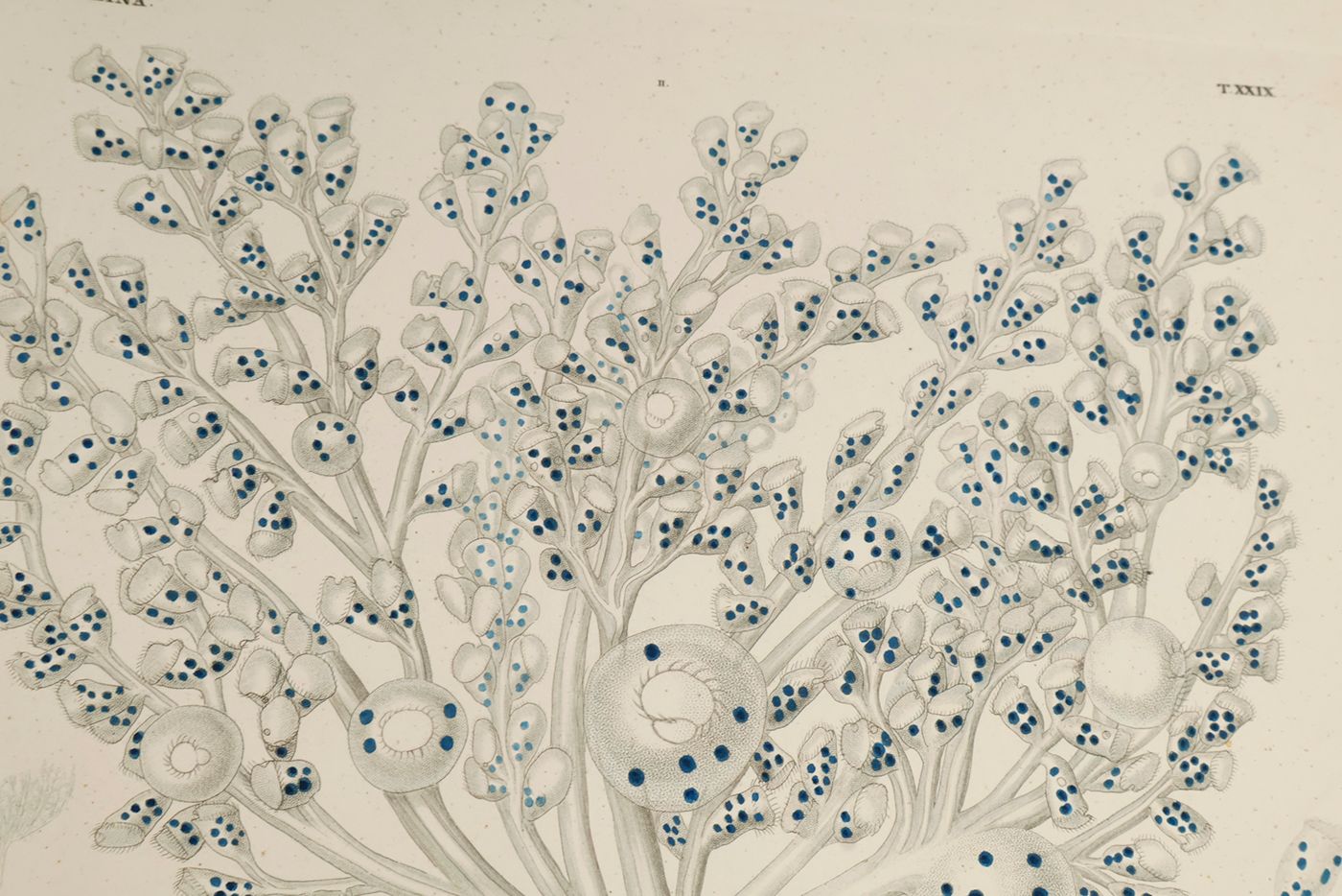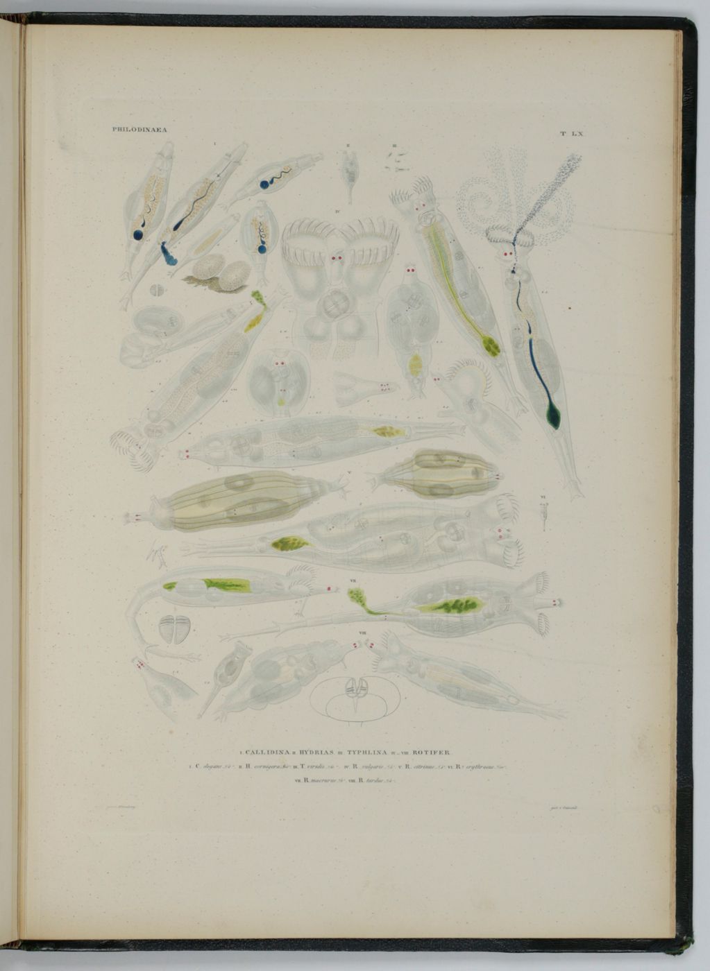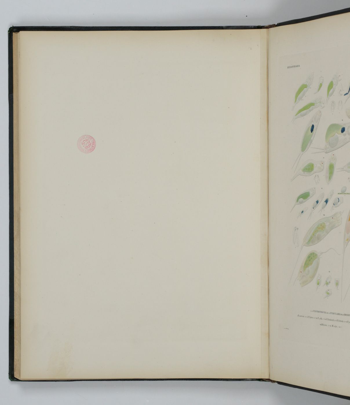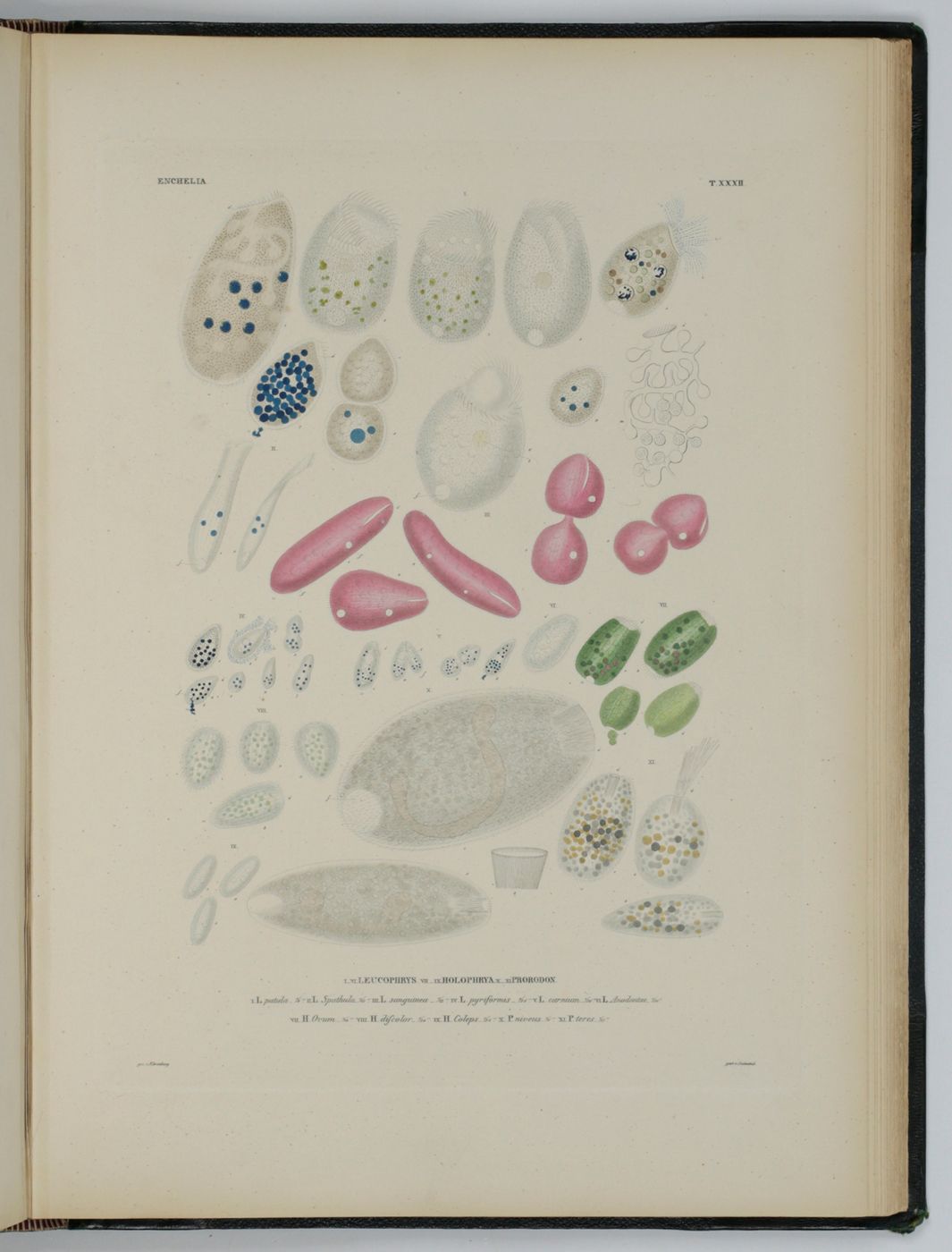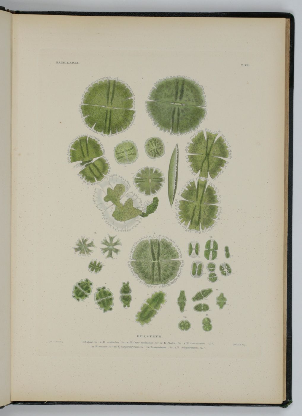 Magnum opus, introducing the systematic study of micro-organisms, and the concept that they are neither animals nor plants, of the German zoologist, explorer, and microscopist Chistian Gottfried Ehrenberg (1795-1876). The fine plates are after original drawings by Ehrenberg himself, who was an accomplished artist. "Ehrenberg was the premier microscopist for most of the 19th century, famous in his time for drawing attention to microorganisms both living and fossil. Today he is credited as one of the founders of protozoology by authoring a "truly monumental monograph", his 1838 Die Infusionsthierschen als volkommene Organismen [this work]. The monograph included an "Atlas" of 64 hand-colored plates illustrating living microorganisms. The work has been described as "the most sumptuously illustrated classic of the field" (Churchill 1989). By the late 1830's, Ehrenberg had turned his attention to studies of the remains of microorganisms in atmospheric dust, soils, minerals and sediments. He was the first to systematically investigate the remains of microorganisms, shells, skeletons, etc., and today is credited as the "Founder of Micropaleontology" (Dolan). Provenance: very small circular stamp of the Quekett Microscopical Club on both titles; a few text page margins, and on plate versos (not shining through), "Presented by Mr [illegible]" (dated 1884); gilt Club logo on spines' foot. Extremities a bit dry and worn or scuffed. Scattered foxing to the text, however, mostly clean. Some plates with minute spotting, due to the paper quality. Very rare work, most copies with more serious paper or foxing problems than here, all considered this is a very good copy. Cat. BM(NH), p. 515; Churchill, F. B. (1989). The guts of the matter: infusoria from Ehrenberg to Bütschli: 1838-1876. In: Journal of the History of Biology, 22 pp. 189-213; Dolan, J. R. (2022) The Lesser-Known Scientific Art of Christian Gottfried Ehrenberg; Nissen ZBI, 1244.