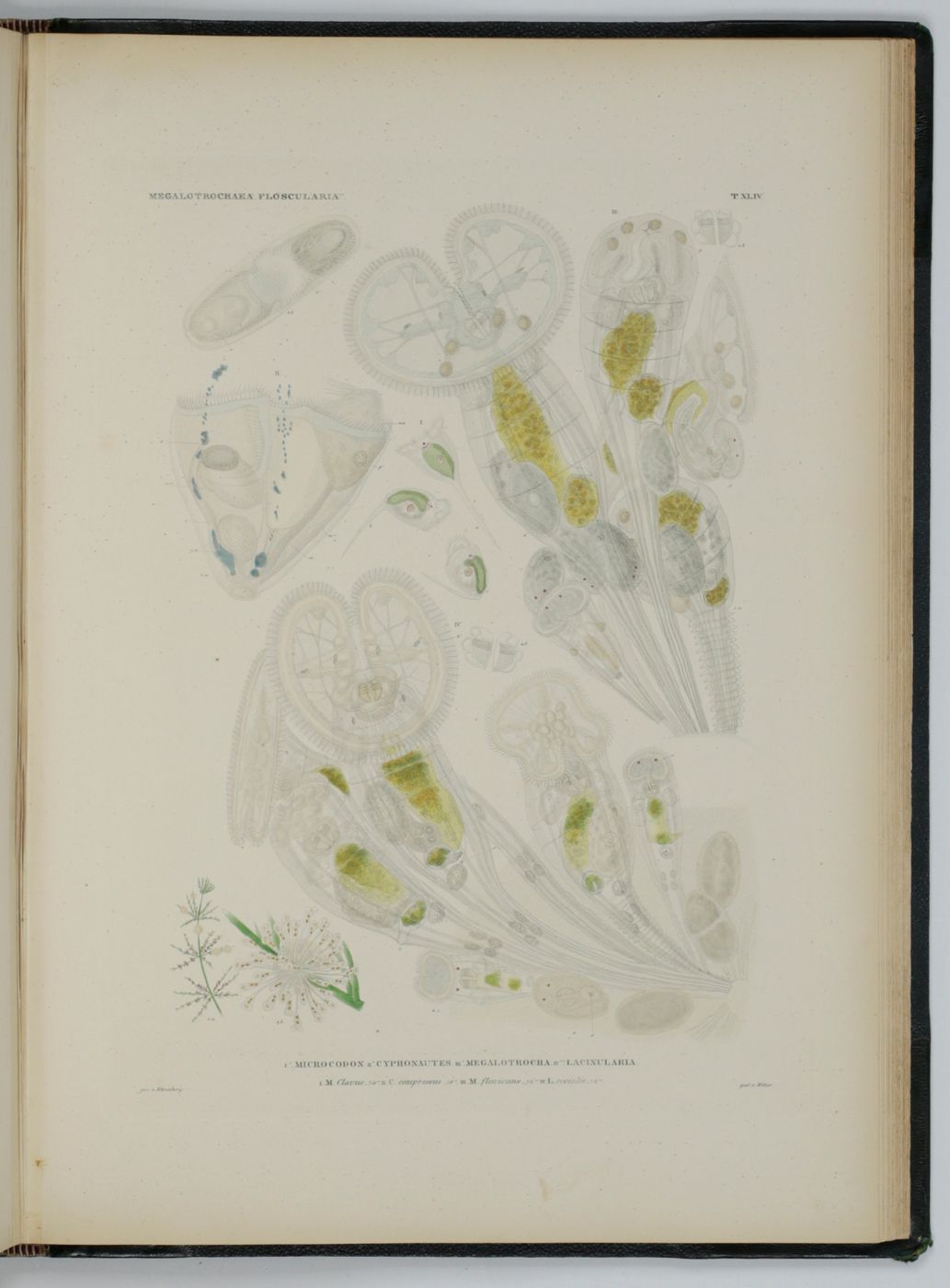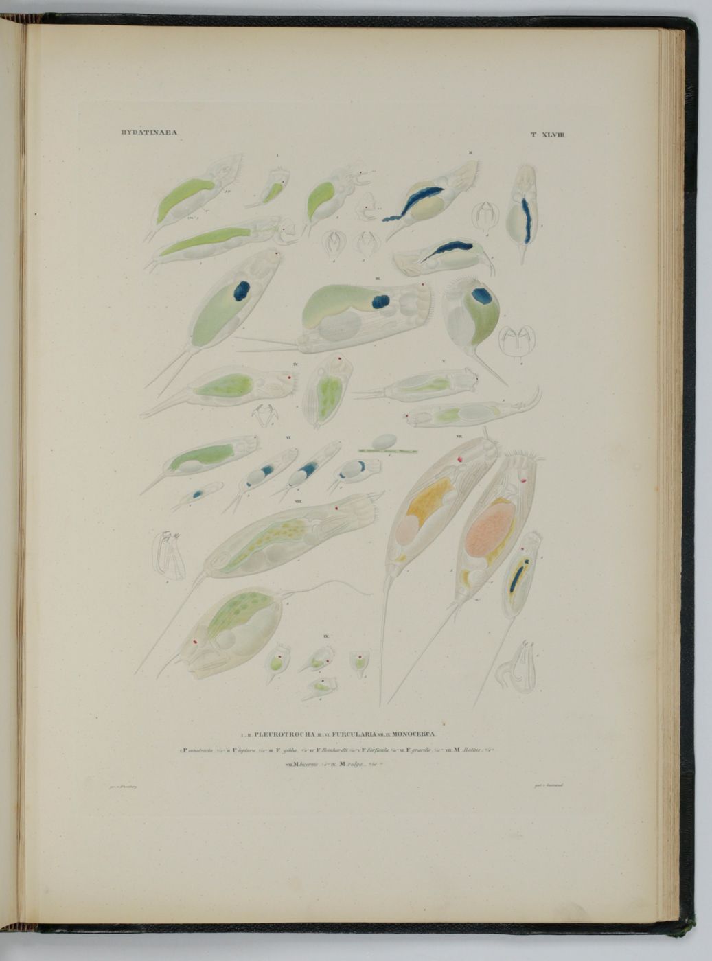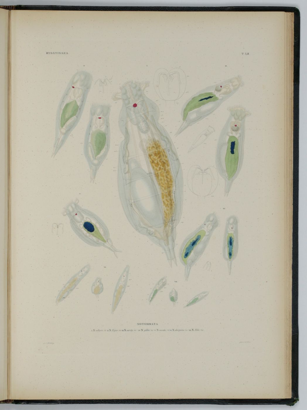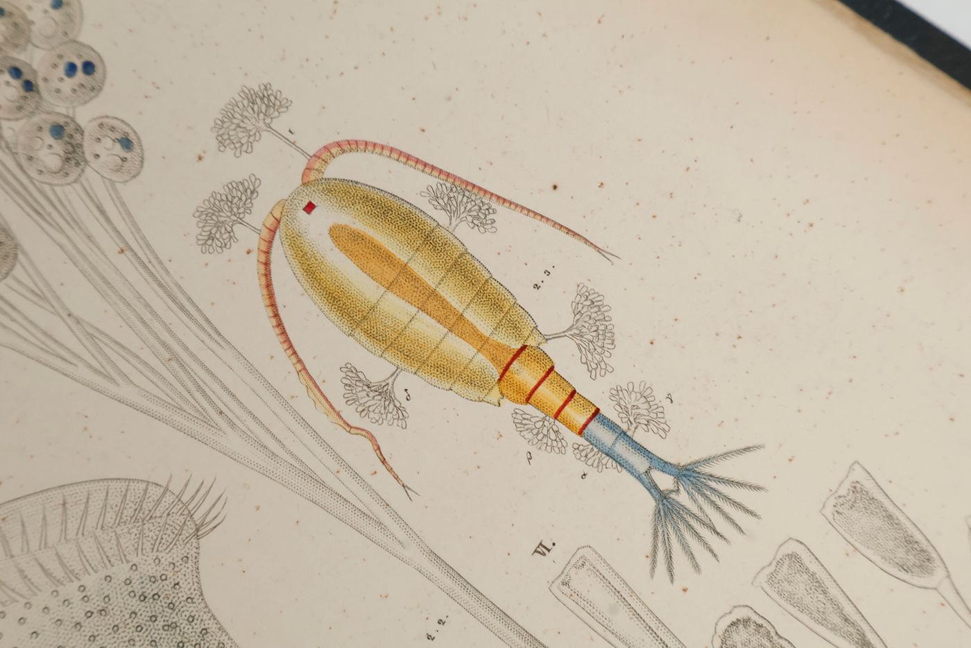 Magnum opus, introducing the systematic study of micro-organisms, and the concept that they are neither animals nor plants, of the German zoologist, explorer, and microscopist Chistian Gottfried Ehrenberg (1795-1876). The fine plates are after original drawings by Ehrenberg himself, who was an accomplished artist. "Ehrenberg was the premier microscopist for most of the 19th century, famous in his time for drawing attention to microorganisms both living and fossil. Today he is credited as one of the founders of protozoology by authoring a "truly monumental monograph", his 1838 Die Infusionsthierschen als volkommene Organismen [this work]. The monograph included an "Atlas" of 64 hand-colored plates illustrating living microorganisms. The work has been described as "the most sumptuously illustrated classic of the field" (Churchill 1989). By the late 1830's, Ehrenberg had turned his attention to studies of the remains of microorganisms in atmospheric dust, soils, minerals and sediments. He was the first to systematically investigate the remains of microorganisms, shells, skeletons, etc., and today is credited as the "Founder of Micropaleontology" (Dolan). Provenance: very small circular stamp of the Quekett Microscopical Club on both titles; a few text page margins, and on plate versos (not shining through), "Presented by Mr [illegible]" (dated 1884); gilt Club logo on spines' foot. Extremities a bit dry and worn or scuffed. Scattered foxing to the text, however, mostly clean. Some plates with minute spotting, due to the paper quality. Very rare work, most copies with more serious paper or foxing problems than here, all considered this is a very good copy. Cat. BM(NH), p. 515; Churchill, F. B. (1989). The guts of the matter: infusoria from Ehrenberg to Bütschli: 1838-1876. In: Journal of the History of Biology, 22 pp. 189-213; Dolan, J. R. (2022) The Lesser-Known Scientific Art of Christian Gottfried Ehrenberg; Nissen ZBI, 1244.