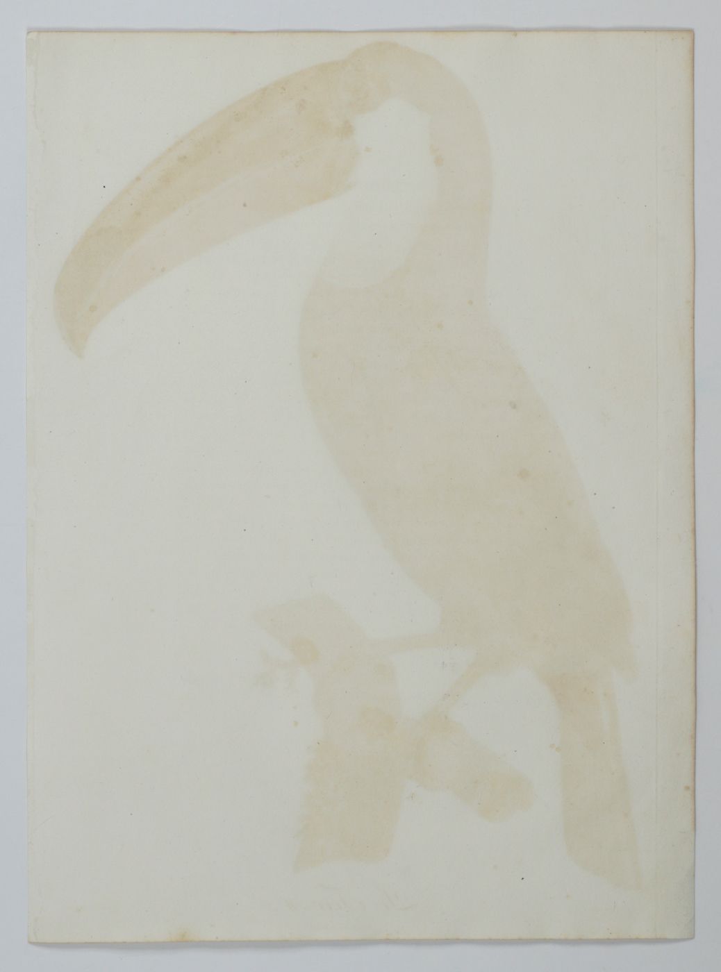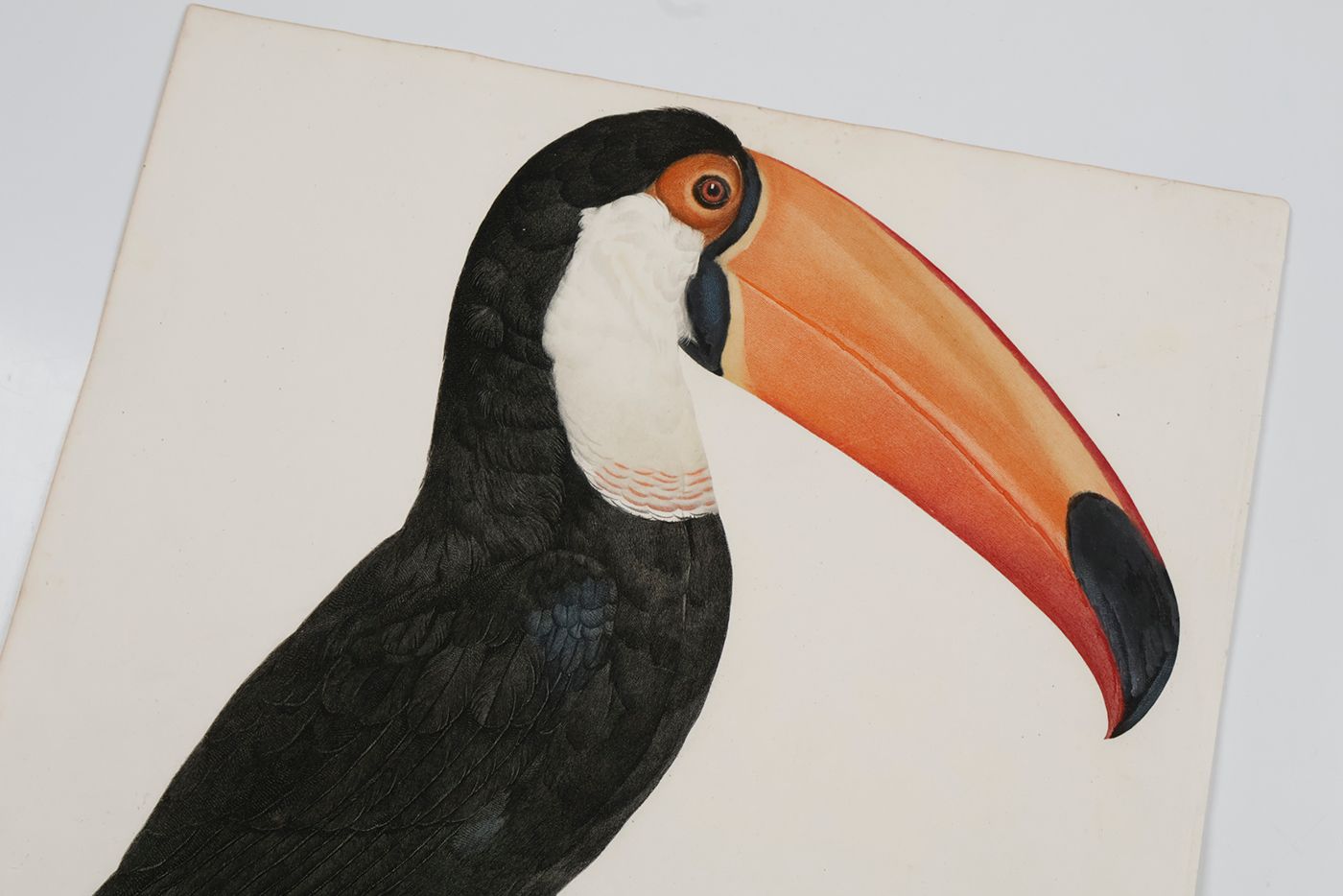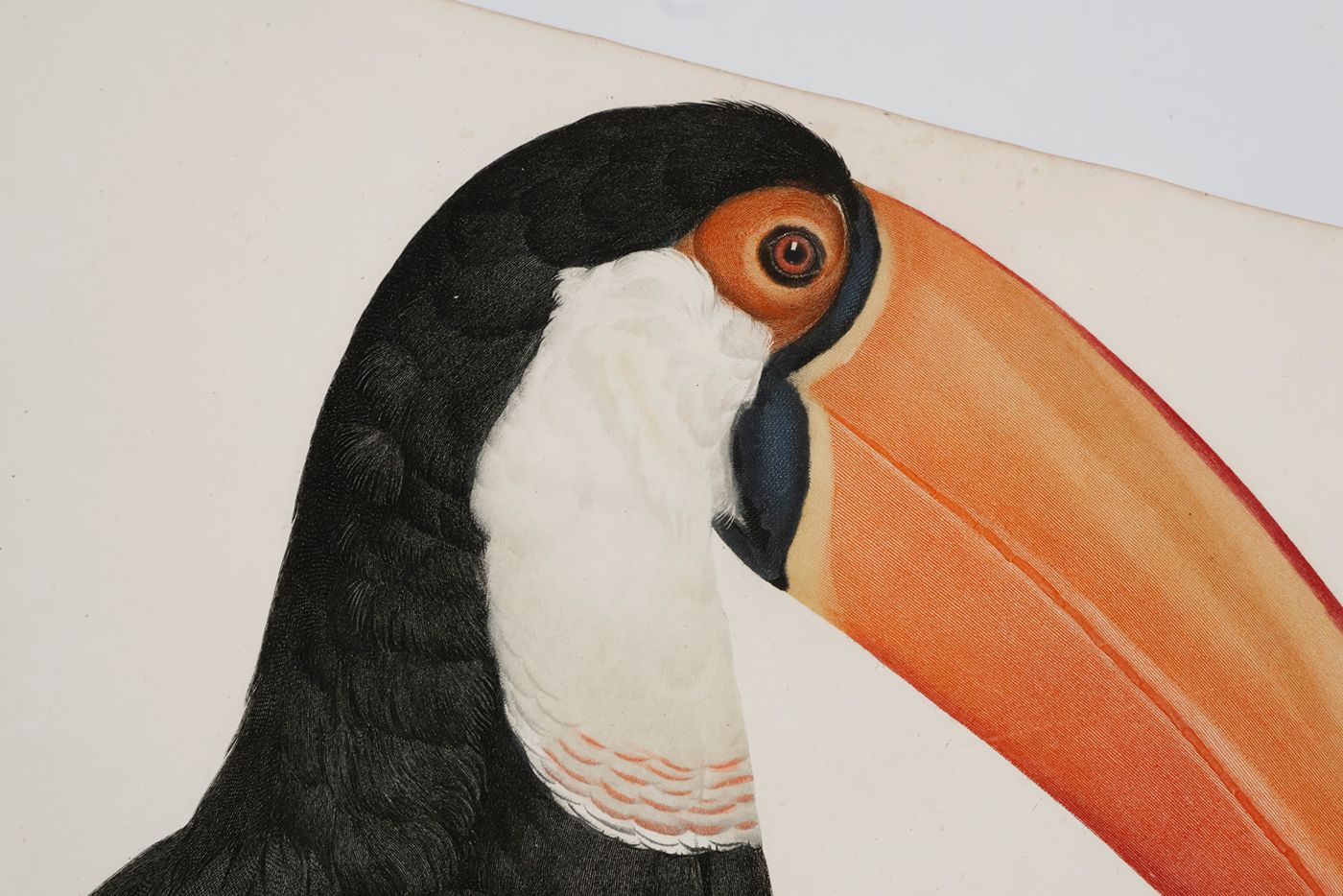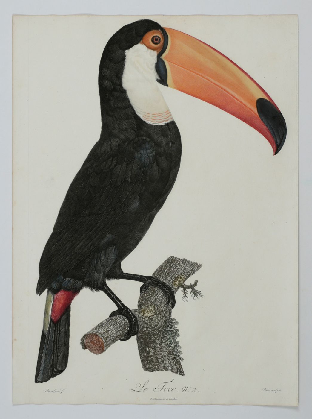 A fine, copper-engraved plate, in very good condition, of one of the world's most spectacular birds, the toco Toucan ( Ramphastos toco) which is the largest species of toucan known. This original plate is the work of one of the period’s foremost bird illustrators, the French artist Jacques Barraband (1767-1809). Barraband's works are esteemed especially for their realism. Although his illustrations were based on mounted specimens, they were considered the most accurate made during the early 1800s. His birds are never stiff, nor are they artistic rather than accurate, as in, for example, the work of Audubon. The toco Toucan from neotropical rain-forests occurs mainly in Brazil, Bolivia, and Paraguay, as well as in some parts of Suriname, Guyana, Uruguay, and Argentina, and, perhaps, Venezuela. Originally published in a work by the French explorer and ornithologist François Levaillant (1753-1824), Histoire Naturelle des Oiseaux de Paradis et des Rolliers, suivie de Celle des Toucans et des Barbus. Levaillant's book is known to be prone to foxing, but this plate forms a rare exception, with only some minor, marginal spotting, otherwise, excellent, clean, the colouring lively and bright. Anker, 304; Nissen IVB, 559; Ronsil, p. 298; Sitwell, p. 118; Zimmer, p. 393.